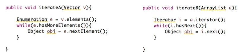 | hasMoreElements(), nextElement() | hasNext(), next(), remove() |