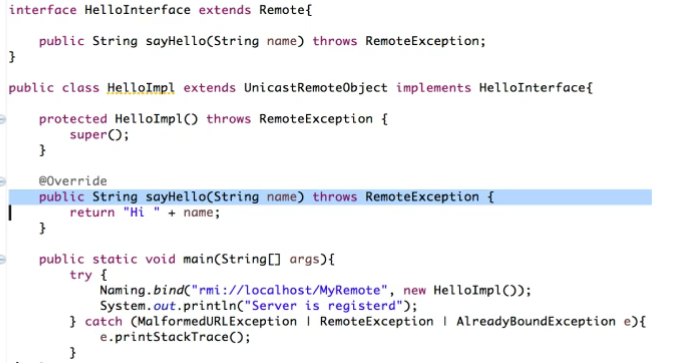 RemoteException 을 throws 하여 구현한다.