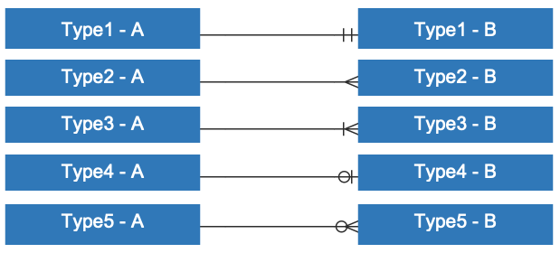- Type1(실선과 실선): 정확히 1 (하나의 A는 하나의 B로 이어져 있다.)