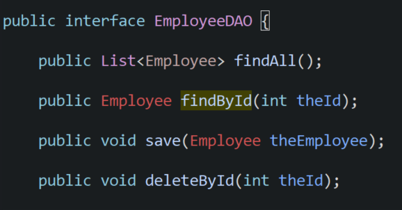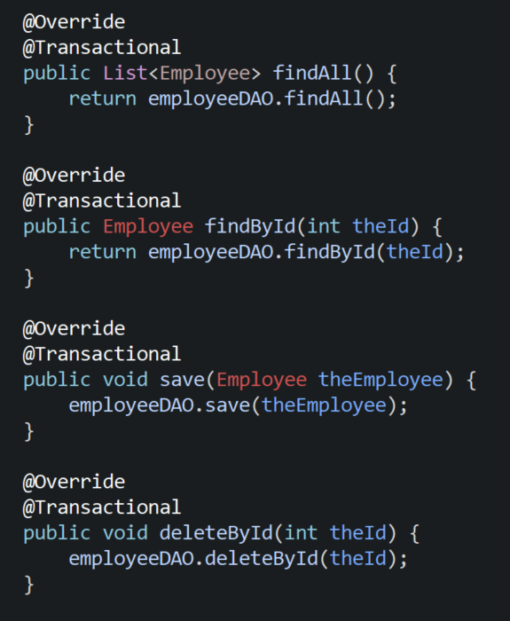구현 클래스도 만드는데 @Service 등록하고 DAO와 생성자, crud메서드 만들어 준다.
