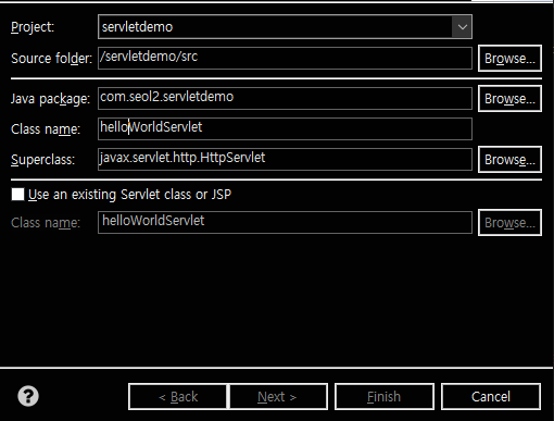 패키지 이름은 com.seol2.servletdemo 이고 클래스 이름은 hellowWorldSevlet으로 만든다.
