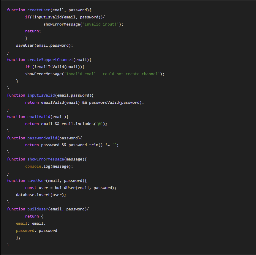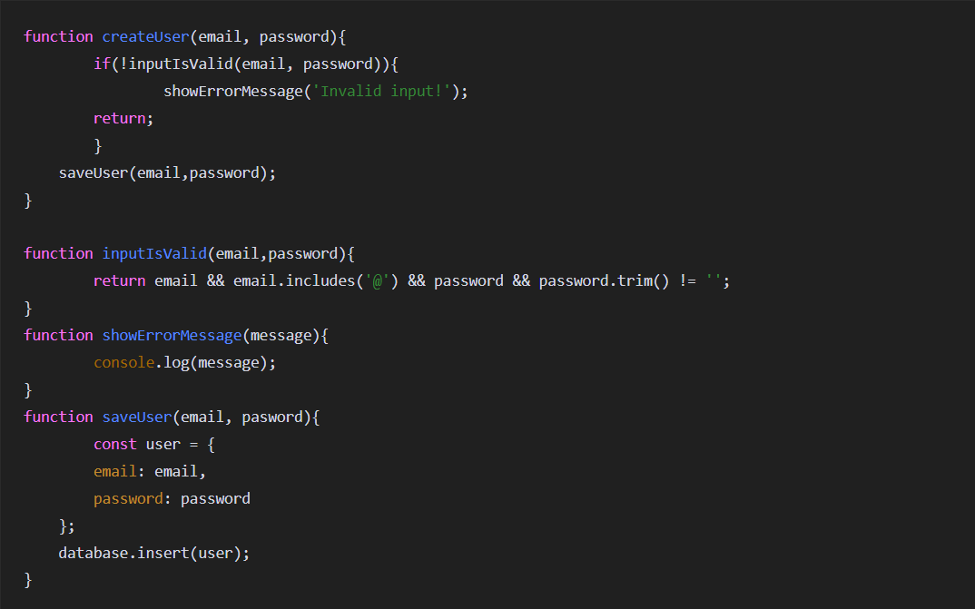 createUser 메소드에 inputIsValid, showErrorMessage, saveUser 메소드로 같은 수준으로 맞춰져있다.