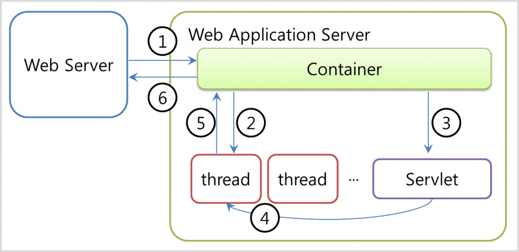 앞단의 Web server는 HTTP 요청을 받아 Web Container로 넘긴다.