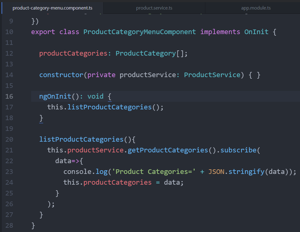컴포넌트는 서비스에서 ProductCategory 클래스 객체를 가져와 배열에 담는다.