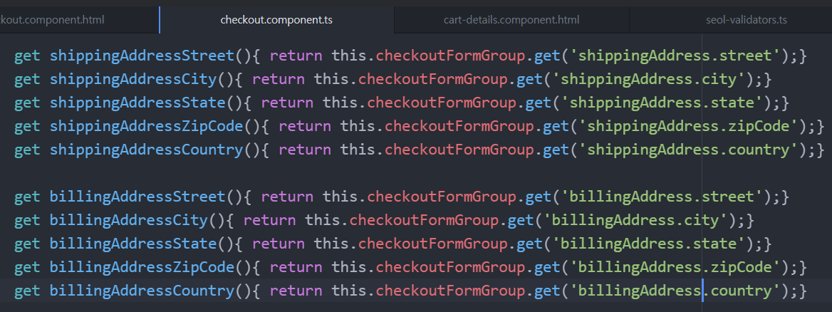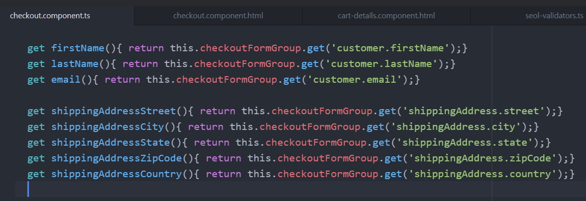 component ts 파일에서 formGroup의 control에 있는 변수값을 가져오는 getter method를 만든다.