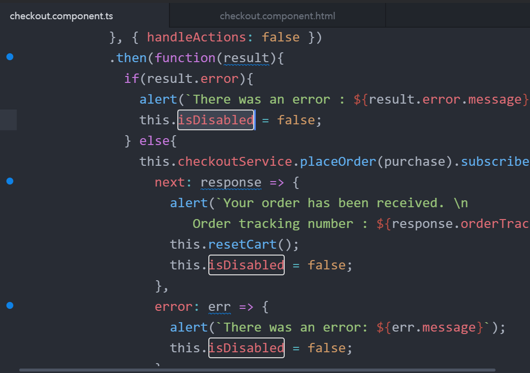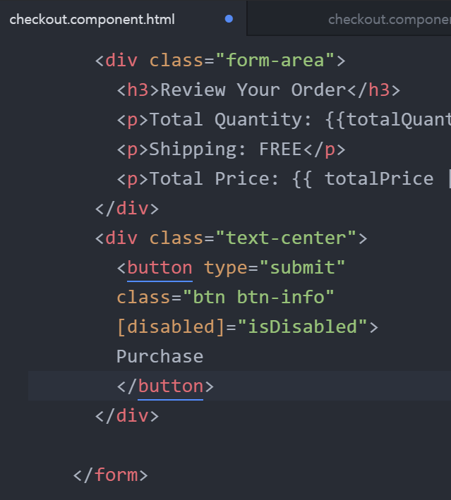 버튼을 checkout.component.ts의 isDisabled 필드에 연결한다.