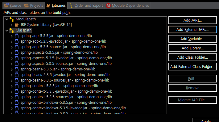 Classpath에 Add JARs를 눌러 스프링 라이브러리를 모두 넣는다.