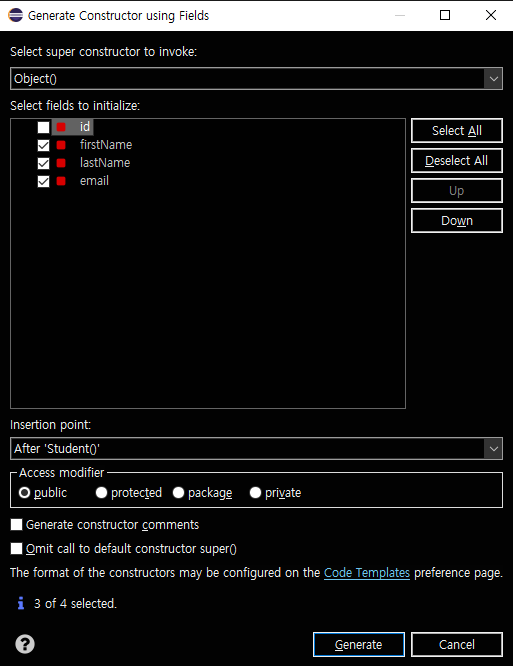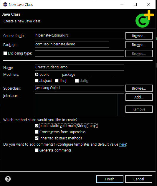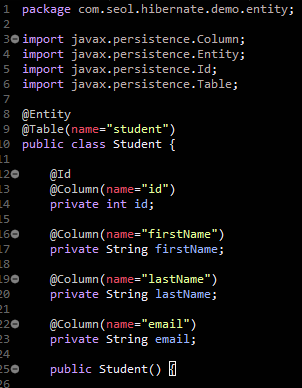 com.seol.hibernate.demo.entity 로 패키지를 만들고 Student 객체 클래스를 만들어 준다.