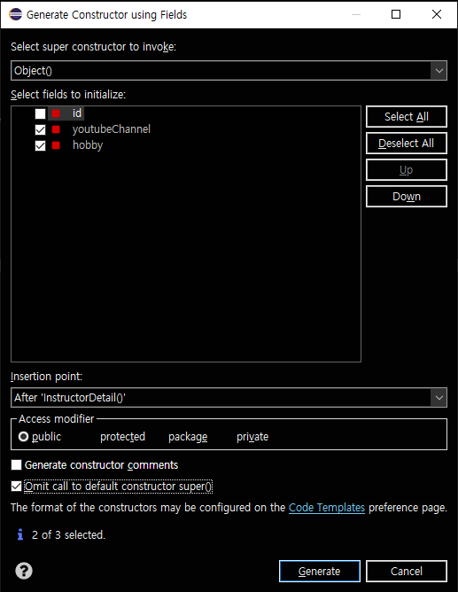 반면에 Getter/Setter 만들 때 필드는 모두 선택해준다.