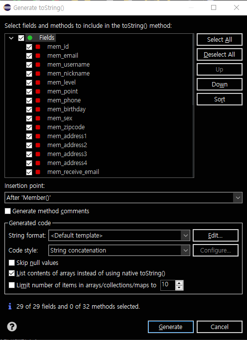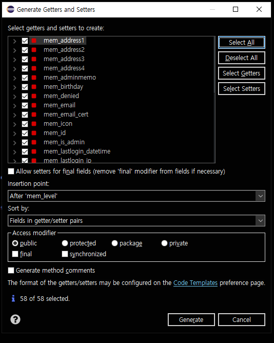 Getter Setter 도 만들어준다. 필드는 모두 선택..