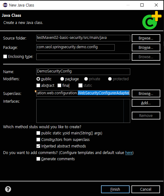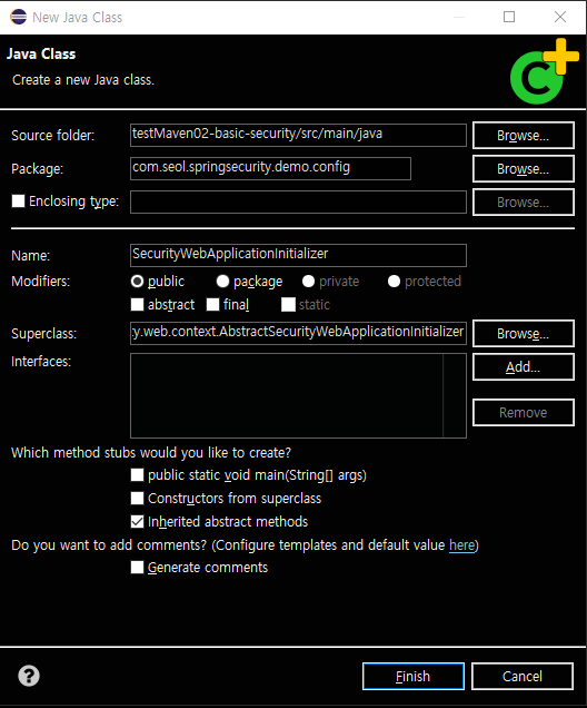 클래스를 하나 만들어준다. Superclass 는 AbstractSecurityWebApplicationInitializer 잊지 말자.